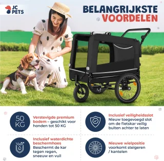 Neem je hond overal mee naartoe zonder zorgen met de vernieuwde JC Pets Hondenfietskar. Dit premium model is speciaal ontwikkeld voor intensief gebruik en combineert maximale draagkracht met slimme veiligheidsdetails en comfort. Dankzij de verstevigde bodem, verbeterde wielpositie en de meegeleverde accessoires kun je genieten van lange tochten, dagelijkse ritjes en outdoor-avonturen — zelfs met zware of grote honden tot 50 kg.
