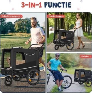 Met het slimme, multifunctionele ontwerp gebruik je de kar als fietskar, jogger of hondenbuggy. Wisselen tussen standen gaat eenvoudig en de universele framebevestiging past op vrijwel alle fietsen — ook e-bikes — zodat je flexibel bent in alle situaties.