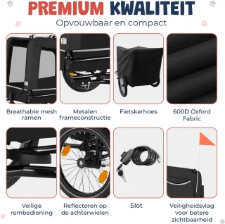Gemaakt van slijtvast 600D Oxford-materiaal in combinatie met een versterkt metalen frame. De kar is bestand tegen regen, modder en intensief gebruik en blijft eenvoudig schoon te maken. Dankzij het easy-fold systeem vouw je de kar snel compact op voor opslag of transport — praktisch voor auto’s en kleine ruimtes.