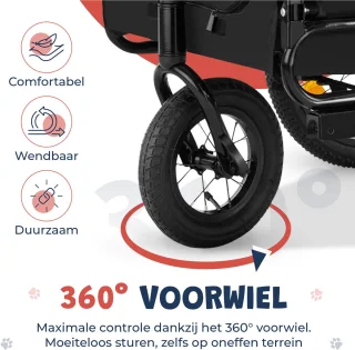 De achterwielen zijn verder naar achteren geplaatst, waardoor de kar veel minder snel kantelt of gaat steigeren wanneer je hond naar achteren gaat zitten. Dit voorkomt een veelvoorkomend probleem bij goedkopere karren en zorgt voor een rustiger en veiliger rijgedrag.