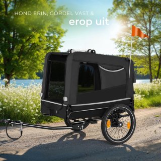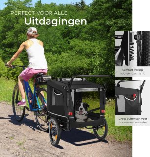 • Veiligheid voorop — Antislip kunststof bodem, stevige vering en een meegeleverd veiligheidstuig houden je hond stabiel tijdens elke rit. Reflectoren, lichtgevende strips en de afneembare waarschuwingsvlag zorgen voor uitstekende zichtbaarheid in het verkeer.
