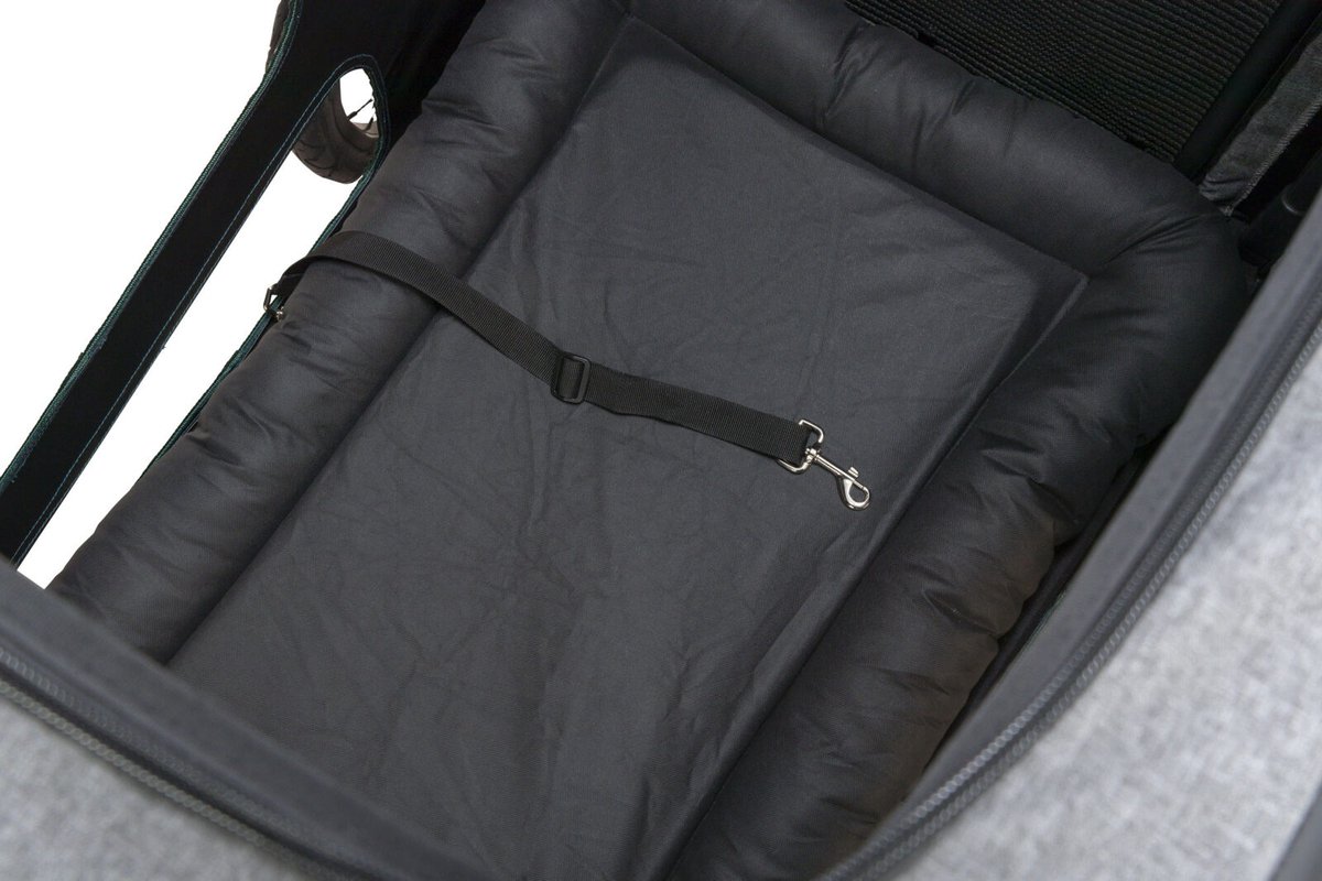 De binnenkant is voorzien van een extra kussen met memory foam, dat zich perfect aan de lichaamsvorm van je hond aanpast. Dit zorgt voor een optimale ondersteuning en extra comfort, zelfs tijdens langere ritten. Daarnaast is de ophanging van de kar ontworpen voor een soepele en comfortabele rit, waardoor je hond niet schudt of erg wordt door de bewegingen.